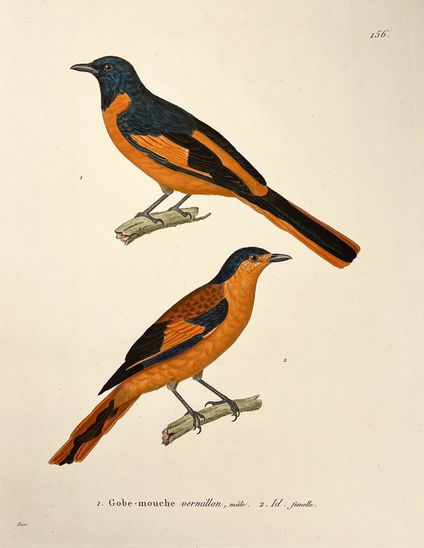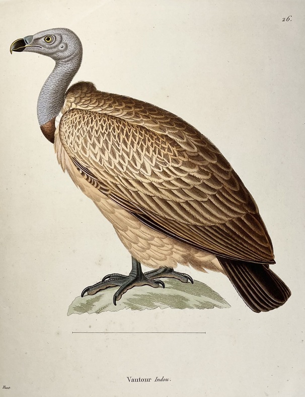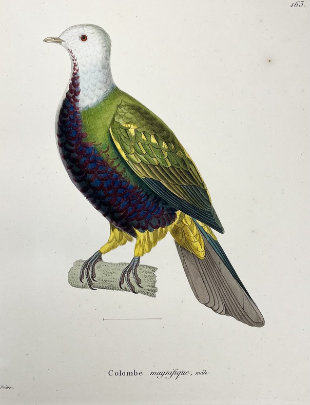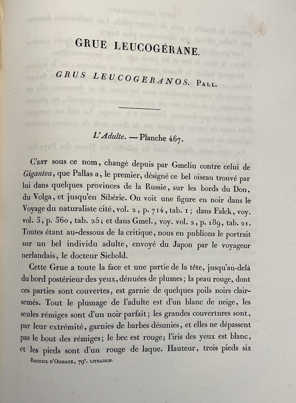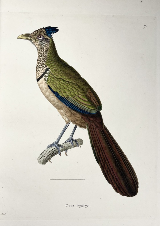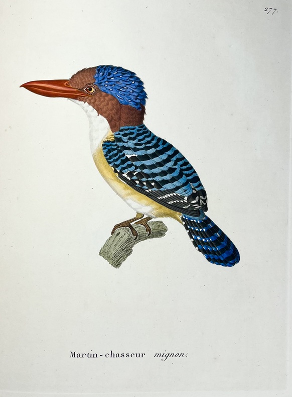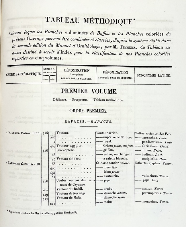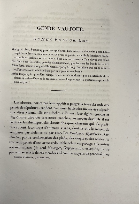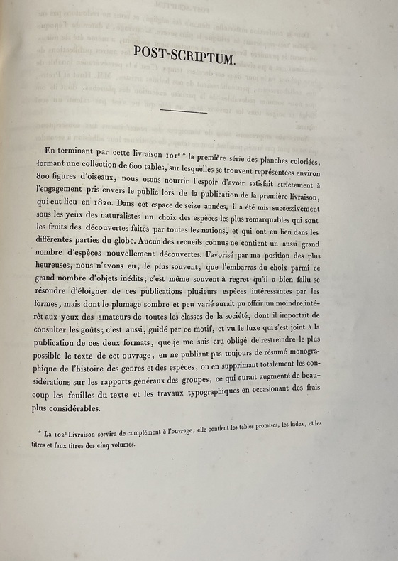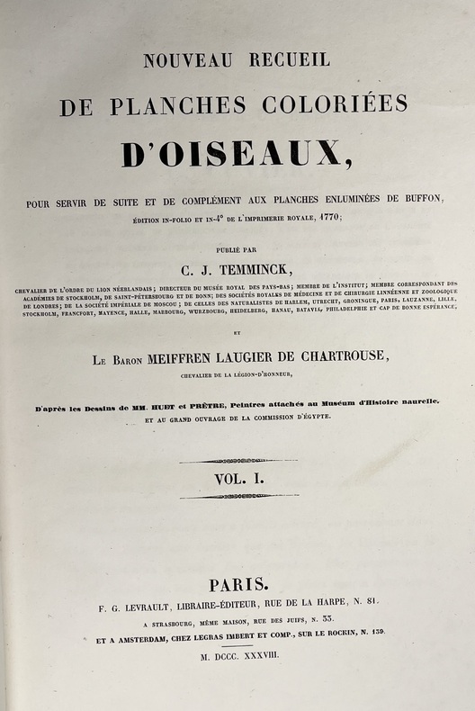Avec ses 600 planches illustrées doiseaux, coloriées et gommées à la main, figurant pas moins de 661 espèces en 800 figures, ce livre est considéré comme lun des plus beaux et des plus importants jamais réalisés sur lornithologie. À son origine : Coenraad Jacob Temminck. Cet aristocrate néerlandais fut formé par lornithologue allemand Meyer, avant de devenir le premier directeur du Muséum national dhistoire naturelle de Leyde, en 1820. Il écrira plusieurs ouvrages devenus des références, dont son Manuel dornithologie en 1815 puis ce Nouveau recueil de planches coloriées doiseaux, entre 1820 et 1839, quil conçoit comme une suite et un complément de lHistoire naturelle des oiseaux du comte de Buffon, parue en 1770-1786. Pour mener à bien cette aventure, il sassocie avec le baron de Chartrouse, à qui lon attribue la partie sur les nouvelles espèces. Temminck se serait quant à lui chargé du volet scientifique. Anobli par Napoléon, Guillaume Meiffren de Laugier fut le maire de sa ville natale dArles et joua un rôle majeur dans la préservation de son patrimoine antique. Mais également passionné dornithologie et de botanique, il travailla sur cet ouvrage avec Temminck, prêtant aux artistes Nicolas Huet et Jean-Gabriel Prêtre de nombreux spécimens de sa propre collection, afin de réaliser les illustrations. Cette édition originale est aujourdhui rare seulement 102 livraisons étant répertoriées et donc très recherchée. Le Nouveau Recueil est important dans la mesure où il décrit et illustre pour la première fois un grand nombre d'oiseaux, mais se démarque également d'autres ouvrages ornithologiques en raison de la grande précision des détails. Exceptionnel ouvrage d'ornithologie, rare et bien complet des 600 magnifiques planches en couleurs. Nissen, IVB 932 ; Brunet, V,694