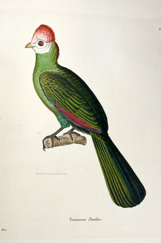 Superbe exemplaire de ce chef duvre des ouvrages dornithologie coédité par Coenraad Temminck et Guillaume Meiffren de Laugier, comportant 600 magnifiques planches doiseaux du monde entier coloriées et gommées à la main figurant plus de 800 oiseaux du monde entier, exécutées daprès les dessins de Jean-Gabriel Prêtre et Nicolas Huet. Coenraad Jacob Temminck (1778-1858) est considéré comme l'un des plus grands ornithologues de son temps. Son père, trésorier de Compagnie néerlandaise des Indes orientales le destinait à devenir un employé de la Compagnie. Mais sensibilisé à l'histoire naturelle par son père dont la collection personnelle est enrichie par François Levaillant (1753-1826), il s'oriente vers l'étude des oiseaux. Il entre alors au service de l'ornithologue allemand Meyer à Offenbach qui l'initie à la taxidermie. Temminck devient le premier directeur du muséum national d'histoire naturelle de Leyde, poste qu'il occupe de 1820 jusqu'à sa mort. Il est lauteur de très nombreux ouvrages, dont « Manuel d'ornithologie, ou Tableau systématique des oiseaux qui se trouvent en Europe » (1815), longtemps la référence sur les oiseaux européens. Mais son chef duvre demeure son présent « Nouveau recueil de planches coloriées d'oiseaux ». Fervent partisan de la classification des espèces, il écrit en 1820 « Plus on voudra sentendre réciproquement par rapport à la nomenclature des genres et des espèces, plus les sciences y gagneront, et moins on aura à soccuper du travail le plus ennuyeux et le plus stérile que je connaisse. ». Il co-édite le présent ouvrage avec le français Guillaume Michel Jérôme Meiffren de Laugier, baron de Chartrouse (1772 -1843), homme politique, restaurateur des monuments romains de sa ville, botaniste et ornithologiste, il prête aux artistes de nombreux spécimens naturalisés de sa collection pour réaliser l'illustration et on considère que c'est Temminck qui est l'auteur de la partie scientifique de l'ouvrage et les espèces nouvelles qui y sont décrites lui sont attribuées. De nombreux animaux, oiseaux et mammifères mais également poissons, lui ont été dédiés comme le bécasseau de Temminck (Calidris temminckii), le courvite de Temminck (Cursorius temminckii), le pic de Temminck (Dendrocopos temminckii), le pangolin de Temminck (Manis temminckii), l'akalat de Temminck (Pellorneum pyrrogenys), le tragopan de Temminck (Tragopan temminckii), le sporophile de Temminck (Sporophila falcirostris), le rollier de Temminck (Coracias temminckii),le Chat de Temminck (pardofelis temninckii)le todirostre de Temminck (Hemitriccus diops) ou le gourami embrasseur (Helostoma temminckii). Les deux illustrateurs sont choisis par les auteurs parmi les tout meilleurs iconographes animaliers de lépoque. Leurs noms sont gravés en bas à gauche de chaque planche : Jean-Gabriel Prêtre (1768 - 1849), peintre d'histoire naturelle franco-suisse qui a illustré des oiseaux, des mammifères et des reptiles dans un grand nombre de livres. Artiste ornithologique hors pair, il travaille d'abord pour le zoo de l'impératrice Joséphine, puis pour le Muséum d'histoire naturelle de Paris. Il dessine les spécimens d'histoire naturelle recueillis lors d'importantes expéditions géographiques et exploratoires françaises, notamment le Voyage de l'Astrolabe de Dumont d'Urville, le Voyage autour du monde de Freycinet, le Voyage autour du monde de Laplace et d'autres. Au début de sa carrière, Prêtre a travaillé en étroite collaboration avec Temminck qui lui a fait le compliment de donner son nom au perroquet à lunettes rouges (Phaethornis pretrei). Artiste prolifique, il a également illustré la Flore d'Oware et de Benin de Palisot, la Flore des Antilles de Tussac, le Dictionnaire des sciences naturelles publié entre 1816 et 1830, et les ouvrages ornithologiques de Lesson et Vieillot. Nicolas Huet (1770 -1830), peintre, dessinateur et graveur français. Il le fils aîné de Jean-Baptiste Huet, lui-même fils de Nicolas Huet l'Ancien, tous peintres et graveurs de la vie animale. Il participe à lexploration scientifique et artistique de lÉgypte de Napoléon entre 1798 et 1801, illustrant ensuite le rapport du gouvernement. Aquarelliste et graveur de talent, il a acquis une réputation de dessinateur d'histoire naturelle. En 1804, il est désigné peintre au Muséum d'histoire naturelle et à la ménagerie, collection d'animaux, d'oiseaux et de plantes de lImpératrice Joséphine. Il a également illustré les travaux des naturalistes Étienne Geoffroy Saint-Hilaire et Georges Cuvier et produit une série de 246 dessins sur vélin, publiés en 1808 sous le titre « Collection de mammifères du Muséum d'histoire naturelle ». Professeur diconographie animale, Il a également créé des dessins élaborés d'animaux, souvent sur vélin, pour des notables comme Frédéric-Auguste II de Saxe, l'officier André Masséna, le prince d'Essling et le duc de Rivoli. Sa contribution à lillustration du « Nouveau recueil des planches colorées d'oiseaux » est magistrale. Le titre annonce que louvrage est destiné à compléter l« Histoire naturelle des oiseaux « de Buffon (1770-1786) : Les très nombreuses explorations autour du monde effectuées depuis le travail de Buffon avaient enrichi lornithologie dun nombre despèces considérable qui justifiait une telle publication. Ainsi lannonce le « prospectus » relié au début du volume 1 : « Les auteurs de la présente entreprise se sont chargés de répondre aux désirs des naturaliste et aux besoins de la science []. Ils offrent en ce moment au public une collection de planches coloriées qui aura pour objet essentiel, les oiseaux qui ne sont pas représenté dans les planches enluminées de Buffon » et plus loin : « Louvrage, paraîtra chaque mois par livraison de six planches confiées aux soins des premiers graveurs en ce genre, daprès les dessins de Monsieur Huet, peintre, attaché au Mu
