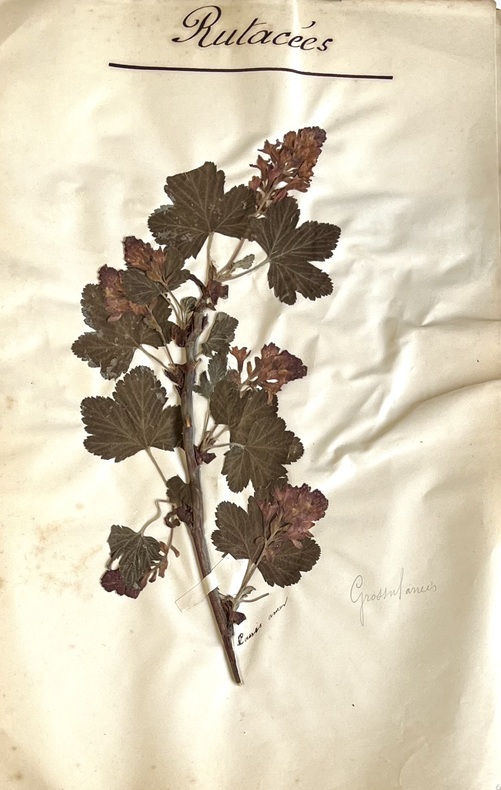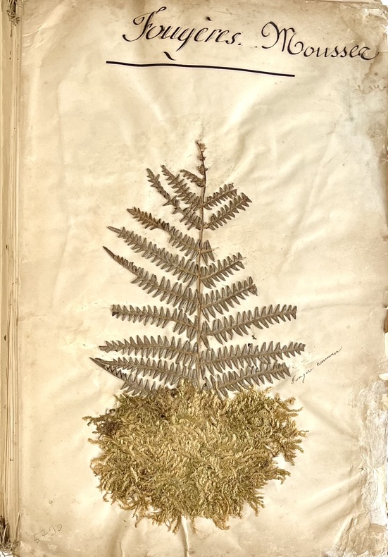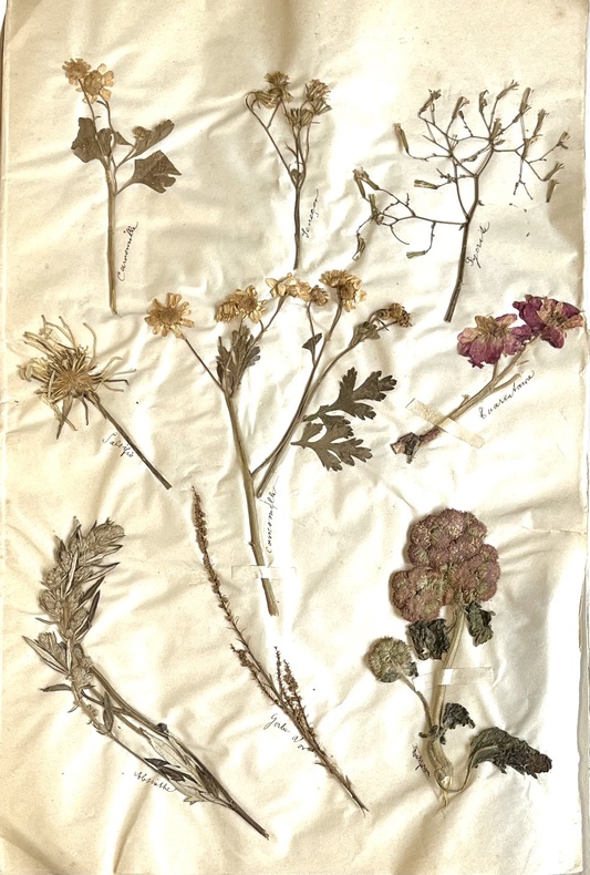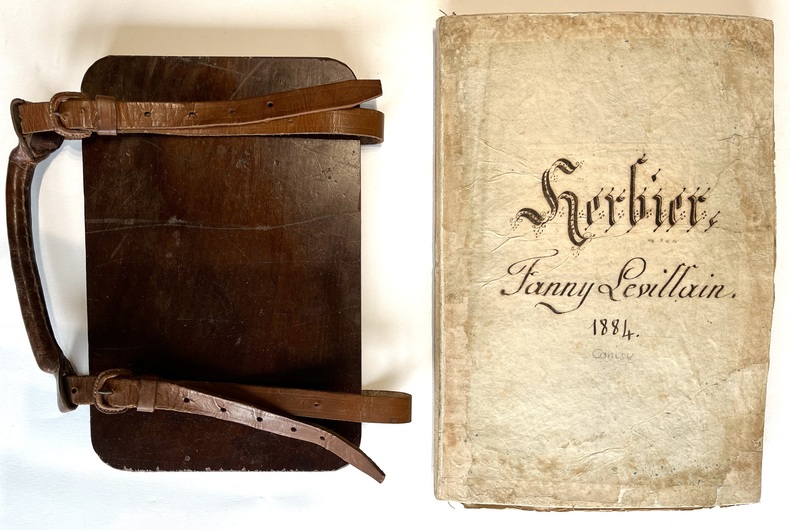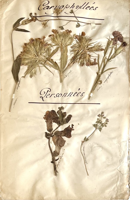 Emouvant herbier réalisé par Fanny Levillain de Canisy dans la Manche en 1884. Il est constitué de 58 feuillets cousus ensembles aux extrémités dont 11 de texte calligraphiés de sa main à l'encre noire, donnant les différents ordres: Malvarres, Violariées, Papavéracées, Labiées, Ombellifères, Légumineuses, Renonculacées, Graminées, Géraniacées, Crucifères, Jasminées et 47 feuillets garnis de 1 à 10 spécimens séchés, contrecollés, titrés et légendés à l'encre ou au crayon de leur nom vulgaire : Fougère commune, illet Poète, Guimauve, Pavot Coquelicot, Valériane, Réséda, Mercuriale, Euphorbe, Liseron, Campanule, Digitale, Sauge, Bugle, Germandrée, Origan, Chardon, Salsifis, Pissenlit, Marguerite, Camomille, Absinthe, Gerbe dor, Bluet, Seau de Salomon, Aspérule Odorante, Véronique, Bruyère commune, Ciguë, Carotte, Fumeterre, Millepertuis, Fraisier, Cerisier, Ronce, Boule de neige, Sureau, Fleur dOranger, Oseille, Sarazin, Acacia, Luzerne, Bouton dor, Pied dalouette, Cassis amer, Géranium sauvage, Capucines ainsi que quelques algues marines. Remarquable travail de collecte, de recherches et de composition réalisé par cette jeune fille dans le cadre de ses études ou en temps quamatrice de botanique. Ensemble bien conservé, dans son état dorigine. 1 vol in-folio (312 x 214) of : 58 ff numbered in pencil, including 11 ff of text in black ink and 47 lined with 1 to 10 dried specimens laminated and captioned in ink or pencil (some missing). Original hardback folder, with calligraphic title on front cover, held in a press consisting of a mahogany board, leather straps and carrying handle. A touching herbarium created by Fanny Levillain of Canisy in La Manche in 1884. It consists of 58 leaves sewn together at the ends, 11 of which are in her handwriting in black ink, listing the various orders: Malvarres, Violariaceae, Papaveraceae, Labiatae, Umbelliferae, Leguminosae, Renonculaceae, Gramineae, Geraniaceae, Cruciferae, Jasmine and 47 leaves with 1 to 10 dried specimens, laminated, titled and captioned in ink or pencil with their common name: Common fern, Poetic carnation, Marshmallow, Poppy, Valerian, Reseda, Mercurial, Euphorbia, Bindweed, Bellflower, Foxglove, Sage, Bugle, Germander, Oregano, Thistle, Salsify, Dandelion, Daisy, Chamomile, Wormwood, Golden sheaf, Bluet, Solomon's bucket, Sweet woodruff, Veronica, Common heather, Hemlock, Carrot, Fumitory, St John's wort, Strawberry, Cherry, Bramble, Snowball, Elder, Orange blossom, Sorrel, Saazin, Acacia, Alfalfa, Buttercup, Larkspur, Blackcurrant, Wild geranium, Nasturtium... as well as a few seaweeds. Remarkable collection, research and composition work carried out by this young girl as part of her studies or as a botanical enthusiast. Well-preserved set, in its original condition.
