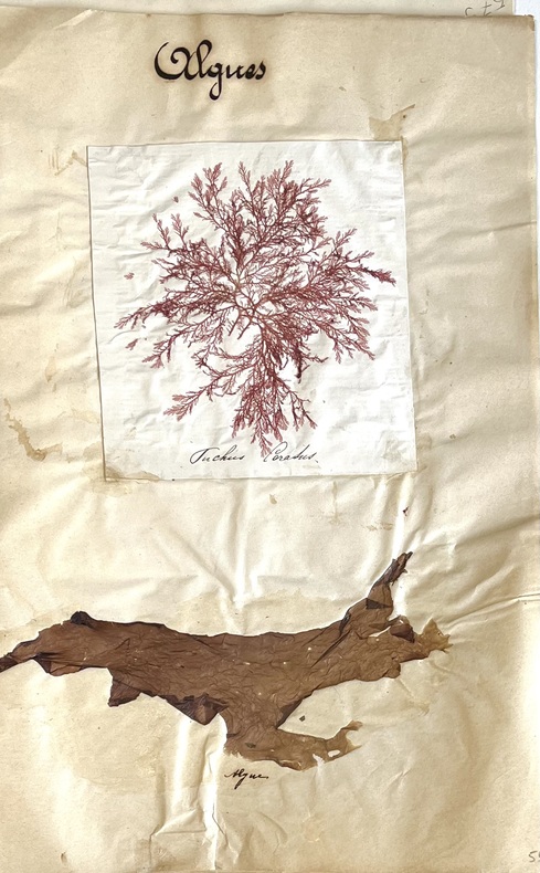 Paris, Institut Catholique, c. 1811-1955, in-folio, environ 1000 spécimens botaniques, 9 portefeuilles à rubans, Ensemble de neuf portefeuilles, contenant des liasses de 100 à 120 feuilles volantes chacune - certaines sous feuille doublée : soit environ 1000 spécimens botaniques. Chaque feuille comporte 1, 2, 3 voire 5 à 10 spécimens, venus du monde entier : France, Algérie, Baléares, Allemagne, Guadeloupe, Laponie, Bolivie, Inde, Mauritanie, Côte d'Ivoire, etc. Les plantes sont réunies par famille et désignées selon des nomenclatures anciennes et la classification de Linné - ou d'autres botanistes - parfois mises à jour ultérieurement au crayon. Les étiquettes donnent en outre les noms des herborisateurs, éventuellement les "missions botaniques" au cours desquelles les spécimens ont été récoltés, les noms vernaculaires, des informations diverses sur les types de terrain, etc... Enfin, chaque feuille porte une étiquette secondaire indiquant "Herb. Univ. Cath. Paris." : il s'agit en effet d'une part de l'herbier constitué pour l'Institut catholique de Paris et qui faisait partie d'une collection beaucoup plus vaste, comportant au moins 15 000 spécimens dans les années 1870 (Péchenard). L'ouvrage est dû à plusieurs contributeurs, récolteurs, collecteurs, collectionneurs de France et d'Europe, entre la deuxième moitié du XIXe siècle et le début du XXe siècle : en tout, environ 74 botanistes sont cités, dont : Paul Émile Botta (1802-1870), archéologue et consul, surtout connu pour ses découvertes archéologiques en Mésopotamie, notamment le palais de Sargon II à Khorsabad; Eugène Bourgeau (1813-1877), botaniste qui a participé à des expéditions, notamment en Amérique du Nord; Ernest Cosson (1819-1889), dont les travaux ont contribué de manière significative à la connaissance de la flore d'Afrique du Nord; Théodore von Heldreich (1822-1902), directeur du Jardin botanique national d'Athènes; Henri de la Perraudière (1831-1861), connu pour son voyage botanique aux Canaries; Louis Charles Trabut (1853-1929), qui a étudié la flore d'Algérie et les plantes médicinales; ou encore Friedrich Welwitsch (1806-1872), botaniste autrichien qui a exploré la flore d'Angola et qui a laissé son nom à la Welwitschia mirabilis. Dès sa fondation en 1875 par Maurice d'Hulst (1841-1896), l'Institut Catholique se dote d'une chaire de botanique et établit un jardin botanique dans le jardin des Carmes. Les premiers professeurs, l'abbé Conil et le docteur Édouard Tison, enrichissent les collections d'étude. Plusieurs donateurs, dont l'abbé Jourdan et Mme Shuttleword, offrent des herbiers et des collections de plantes. Enfin, le docteur Tison transforme le jardin en un espace botanique riche de 2223 espèces de plantes. Pourtant, le nombre de candidats aux cours de botanique reste faible. La chaire de botanique est supprimée en 1880, au nom de la loi réservant la délivrance des diplômes de sciences naturelles aux établissements publics. Une tentative de rétablir les cours en 1886 échoue, puis, en 1891, le jardin est remplacé par des cultures maraîchères. La botanique fait ainsi l'objet d'un enseignement complémentaire, dans lequel l'abbé Jean Augier (1909-1997) joue un rôle majeur, grâce à sa contribution sur l'étude des algues rouges et des mousses. La matière ne figure aujourd'hui plus au programme de l'Institut. Herbier en ordre et en très bon état général de conservation. Les spécimens sont fixés et globalement bien renseignés. Ils sont classés par famille. Certains sont identifiés de façon incomplète ou illisibles. Quelques feuilles ont perdu les rubans servant à fixer les spécimens. Quelques mouillures. Petites déchirures et pliures en bord et marge de quelques feuilles. Les étiquettes de repérage des familles en bordures sont parfois abîmées. P.-L. Péchenard, L'Institut catholique de Paris, 1875-1901, 1902, Ch. Poussièlgue, p.183. Nos Couverture rigide
