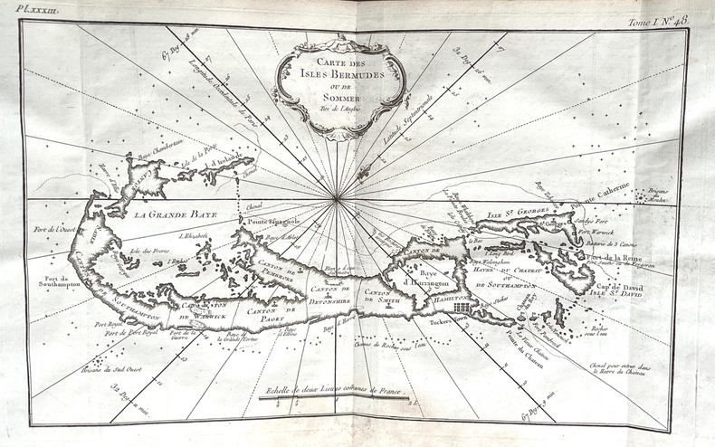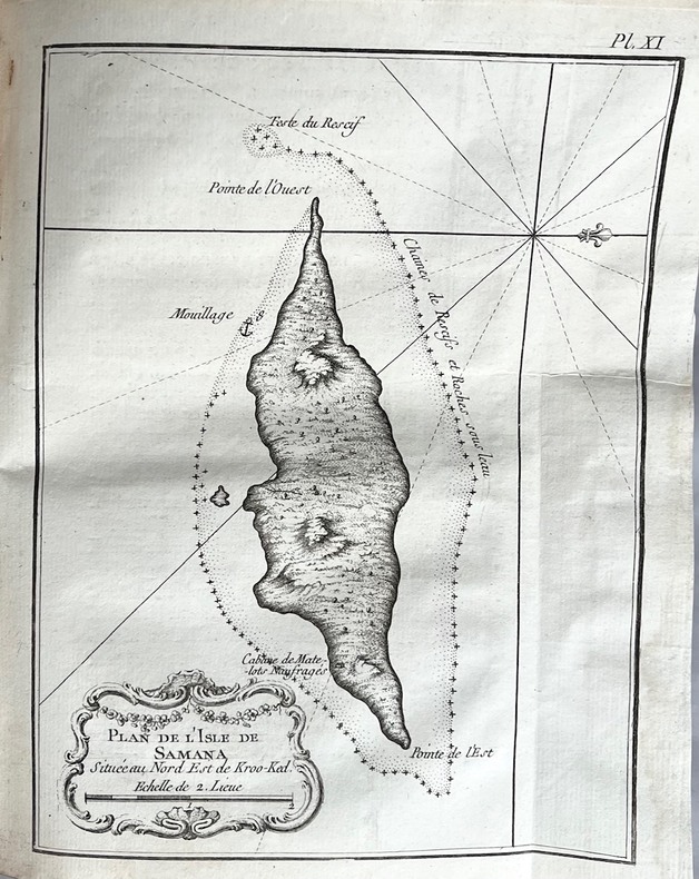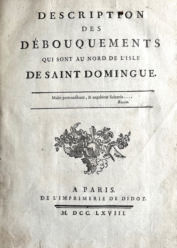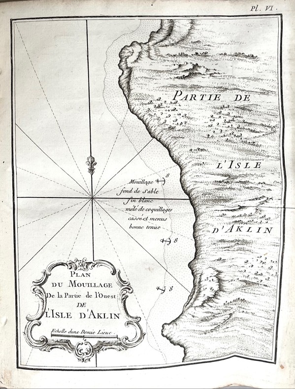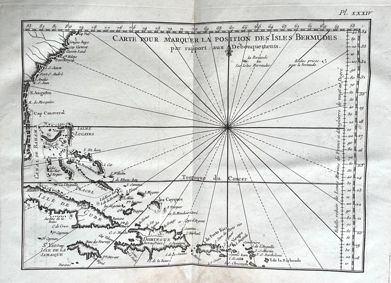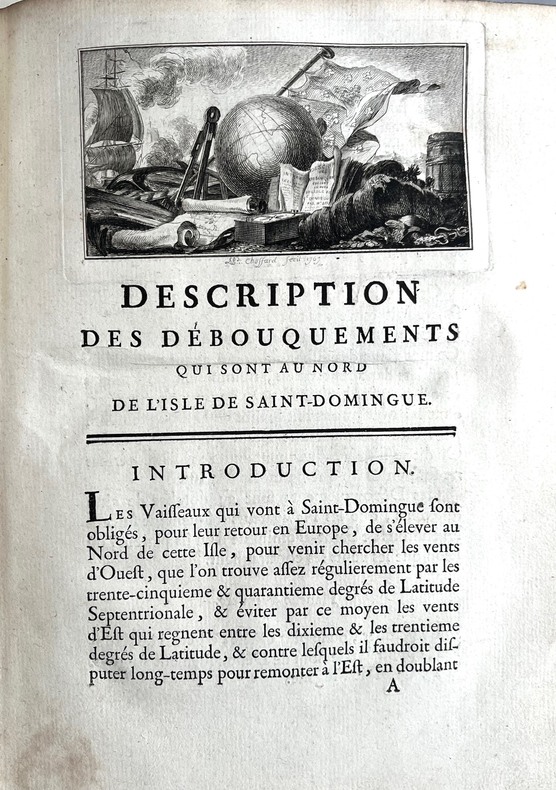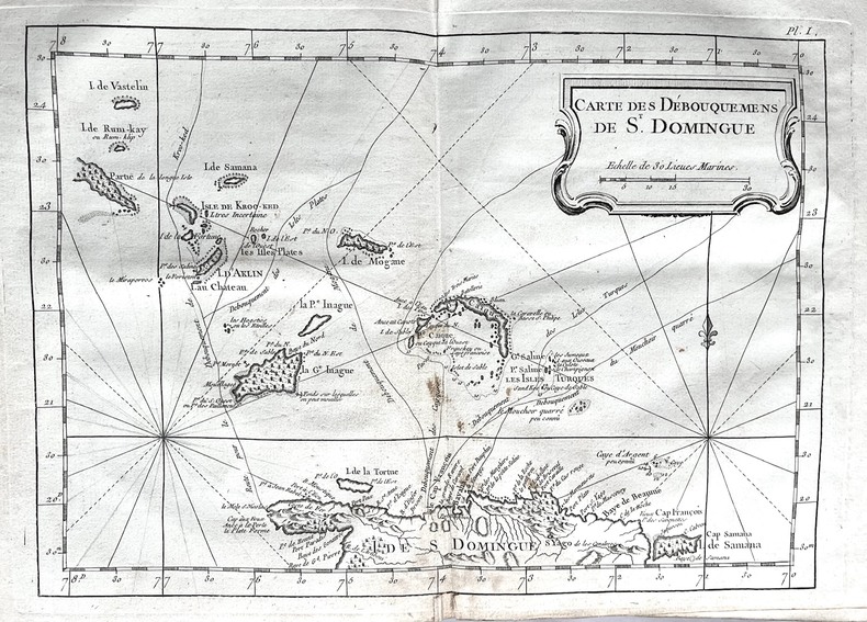 Edition originale de ce remarquable routier des Antilles par le premier hydrographe de la Marine royale française, Jacques-Nicolas Bellin (1703-1772). Figure incontournable de la cartographie au XVIIIe siècle, Bellin passe cinquante ans au Dépôt des Cartes et Plans, où il réalise son «Neptune François», les 59 cartes de toutes les régions du monde de son « Hydrographie française » (1 volume, 1753) et le « Petit Atlas Maritime » (5 volumes, 1764), bréviaire des navigateurs pendant plusieurs décennies. Dans le présent ouvrage, il rassemble et publie les informations collectées par des officiers et ingénieurs de la Marine envoyés dans les Antilles pour établir une cartographie précise des débouquements de St Domingue, de larchipel des Bahamas, de la presquîle de Floride, des îles turques et caïques et de larchipel des Bermudes. A la deuxième page de lintroduction, Bellin donne la définition suivante du mot débouquement: « On entend par le mot de Débouquement, un passage étroit entre les terres, dans lequel il faut faire route pour sortir dun parage, ou quitter une côte. Ce mot vient des Espagnols, qui ayant navigué les premiers dans ces cantons, nommèrent ces Passages & ces Entrées Bocca, en français Bouches, dont les Marins ont fait le mot de Débouquement, pour dire sortir dune Bouche ou Passage étroit ». Ces passages étroits étaient particulièrement périlleux mais indispensables à prendre afin de rallier les Antilles à lEurope. La connaissance précise des débouquements des Antilles était dun intérêt capital pour la navigation dans ces eaux. Le travail de compilation de Bellin dans cet ouvrage est donc dune aide considérable pour les activités françaises dans les Antilles. En 8 chapitres, il fait un inventaire très complet et détaillé de St Domingue, de larchipel des Bahamas et des îles Turques et Caïques. Son travail se compose de nombreuses cartes et plans des passages à prendre ainsi que dexplication précieuses sur les dangers à éviter. Ainsi, il présente les débouquements des îles de: Crooked Island, Aklins ou encore Inagua aux Bahamas et renseigner également sur les variations et courants autour de ces îles. Il poursuit avec ceux des Îles Turques Caïques dont: «La petite Caïque», «la grande Caïque», la Saline (Salt Cay) et la Sandkée (Sand Cay) puis donne quelques anses pour mouiller telles que: «Anse au Canot» ou «Anse à lEau». La côte septentrionale de Saint Domingue ainsi que ses débouquements sont abordé dans le 6ème chapitre dont Cap François (Cap Haïtien). Enfin, dans le chapitre 7 il est question du Canal de Bahama et de la presquîle de Floride puis, dans le 8ème et dernier, Bellin aborde larchipel des Bermudes. Sur chacune des 34 cartes de louvrage, les débouquements sont représentés avec un tracé en pointillé. Parmi les cartes fournies on trouve notamment une carte générale du Nord de St Domingue et de ses cinq débouquements ainsi quune autre du Canal de Bahama représentant le sud du Golfe du Mexique. Bel exemplaire conservé dans sa reliure d'origine.