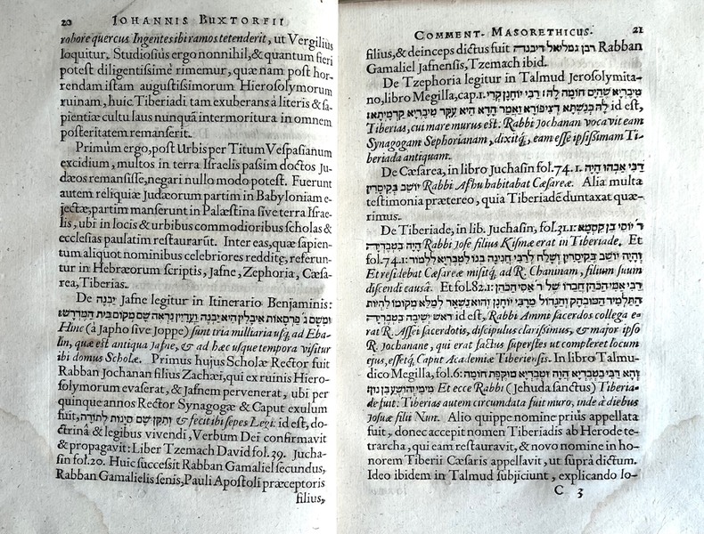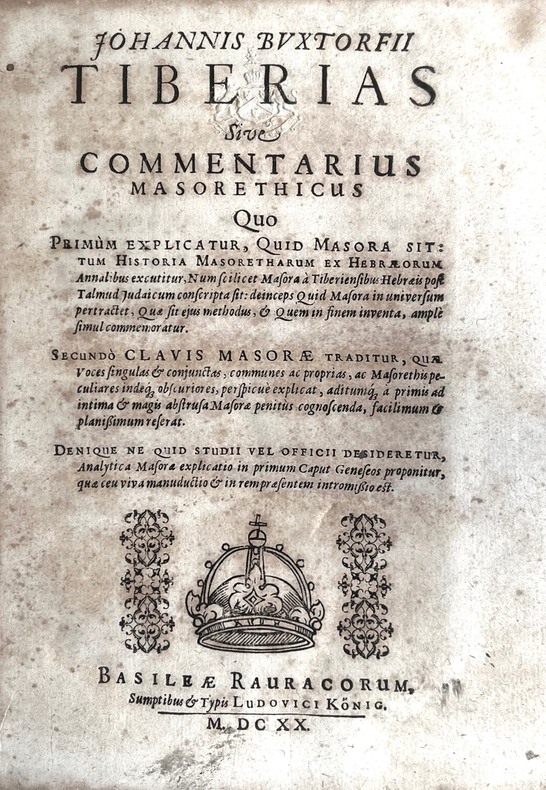 The uncommon first edition of Buxtorf’s work on the tradition of the Masoretes of Tiberias. Here Buxtorf discusses various aspects of Tiberias, including its geographical, historical, and cultural significance. Intended as the supplement to his famous Biblia Rabbinica the present work gained fame and acknowledgment in its own right.The work is structured into three sections: Commentary on the Masorah, Key of the Masorah, and Critical Commentary. While Buxtorf maintains the belief that the Masoretic text represents the authentic version of the Bible, he embraces Levita's groundbreaking theory asserting that the masoretic vocalization and cantillation marks originated with Ezra and the Men of the Great Assembly. ""Tiberias was the first Latin language introduction to biblical scholarship, and its paratextual elements, and the Masoretic apparatus"" (The Oxford Handbook of Early Modern Theology, 1600-1800, edited by U.L. Lehner et al., 2016). ""Tiberias is Buxtorf’s fullest and most impressive work on the history of the biblical text. He conceived it as the first of four proposed guides to the four parts of the Basel rabbinical Bible edition: Hebrew text, Targums, rabbinical Bible commentaries and Masora."" (Burnett). Tiberias holds importance in Jewish history, particularly during the period of the Talmudic and post-Talmudic eras. The city is located on the western shore of the Sea of Galilee and is associated with the development of Jewish traditions and scholarship. While Buxtorf is perhaps more famous for his Hebrew lexicons and grammatical works, ""Tiberias, sive Commentarius"" reflects his broader interest in Jewish history and culture, specifically focusing on a city that played a notable role in the development of Jewish learning and tradition. Johann Buxtorf (1564-1629), the ""Master of the Rabbis,"" despite being a Protestant, was a Hebrew professor at the University of Basel for thirty-nine years. Upon his death, his position passed to his son Johann, known as Buxtorf the Younger (1599-1664), and then to his grandson, Johann Jakob (1645-1704). Throughout his life, he worked on the Masoretic text of the Old Testament, largely established by the Tiberian School in the 9th century. This text defined the authoritative biblical canon within Judaism and served as a reference for most Protestant and Catholic translations of the Old Testament. Buxtorf's work was enlarged and expanded by his son Johannes Buxtorf the Younger, in a second edition printed in 1665.
