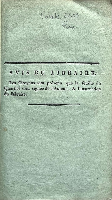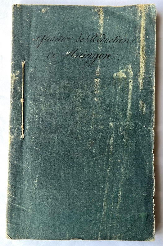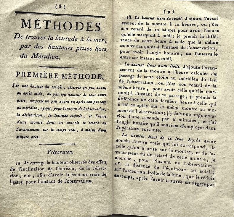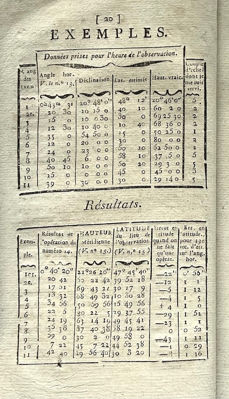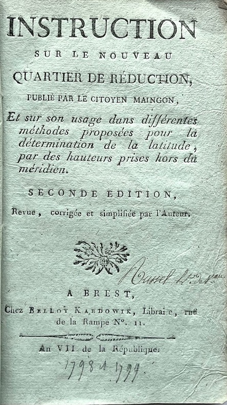 Rare publication imprimée à Brest à petit nombre, consacrée à une méthode de calcul de la latitude. Son éditeur, le citoyen Maingon, indique dans son introduction : « Les Navigateurs, courent souvent les plus grands dangers dans leurs atterrages, faute d'avoir une latitude observée : Cette considération a engagé quelques-uns des meilleurs Auteurs à proposer différentes Méthodes qui ne supposent point l'observation immédiate de la hauteur méridienne, et qui, appliquées dans des circonstances convenables, donnent, au défaut de cette hauteur, la latitude avec une exactitude suffisante. La même considération et le désir dêtre utile m'ont engagé aussi à faire quelques recherches dont les premières m'ont fait rencontrer une Méthode très. Simple, imprimée à Brest en 1788 » Louvrage présente différentes méthodes utilisant le quartier de réduction. Il comporte des tableaux dexemples à mi-page. Exemplaire conservé dans son état dorigine. Polak, 6263. 1 vol. 12mo (188 x 115 mm) of: [1] f. (Bookseller's notice), 58 pp.; 5 tables in the text. (Handwritten bookplate on title page: Aussel, Lieutenant de Vaisseau, small angular stain on last pages). Original blue paper binding with handwritten title in brown ink. (Signs of wear). Rare publication printed in Brest in small numbers, devoted to a method of calculating latitude. Its publisher, Citizen Maingon, states in his introduction: "Navigators often face the greatest dangers when approaching land because they do not have an observed latitude: This consideration has led some of the best authors to propose different methods that do not require immediate observation of the meridian height and which, when applied in suitable circumstances, give the latitude with sufficient accuracy in the absence of this height. The same consideration and the desire to be useful have also led me to conduct some research, the first results of which led me to discover a very simple method, printed in Brest in 1788..." The work presents various methods using the reduction quadrant. It includes tables of examples on half-pages. Copy preserved in its original condition. Polak, 6263.