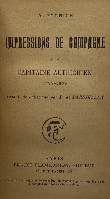 A. Ellrich est le pseudonyme d'Albin Medlhammer, auteur autrichien.Tulard, 496. "Traduction d'un ouvrage paru à Meisen en 1835. Le dernier chapitre concernant les rumeurs qui ont couru sur la mort de Napoléon pendant la campagne de 1809 méritent seuls quelque intérêt".Fierro, 508. - - VENTE PAR CORRESPONDANCE UNIQUEMENT