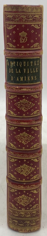 Cette dernière édition à paraître du vivant de l'auteur est normalement la troisième, après celles de 1621 et 1622. Mais il y aurait eu, d'après Macqueron (Bibliographie de la Somme, pp. 213-214) une édition intermédiaire en 1624.En tout cas, c'est là le travail de toute une vie d'érudit : le chanoine Adrien de La Morlière (1560-1629) avait consacré ses loisirs à l'étude des monuments historiques de sa ville et du diocèse. La composition de son ouvrage est particulièrement complexe, l'auteur ayant truffé le texte de pièces de poésie circonstancielles, possédant généralement une page de titre séparée et une date différente de celle du recueil lui-même, mais sans que l'ordre de la pagination en soit troublé.Saffroy II, 31807. Cioranescu, XVII, 39666.Chiffre couronné au dos (D) non identifié.Exemplaire du duc de Devonshire (famille Cavendish), avec vignette ex-libris de Chatsworth (XIXe siècle) contrecollée sur les premières gardes.Bel exemplaire au dos recouvert de maroquin rouge orné. - - VENTE PAR CORRESPONDANCE UNIQUEMENT