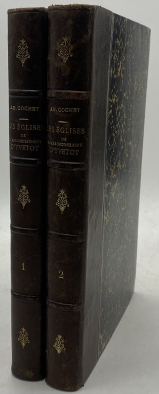 Paris, Didron, Derache, - Rouen, Lebrument, Fleury, etc, 1852. 2 vol. rel. moderne, grand in-8, demi-chagrin marron, bordé d'un double filet à froid, dos à nerfs titré et tomé, bordé d'un filet à froid, plats marbrés, gardes marbrées, 1f.bl., couvertures d'origine conservées (très brunies, avec petites déch. d'usage), 1f.bl.,(2)ff.-369pp, errata, if. bl.; 1f.bl., 430pp, illustré de 39 gravures sur bois in et h.-t., errata, liste des souscripteurs, (4)ff., 1f.bl. ouvrage vendu par souscription à 413 ex. ; joint 2 documents manuscrits anciens de notes archéologiques. 2 ex-libris, dont un bien illustré.