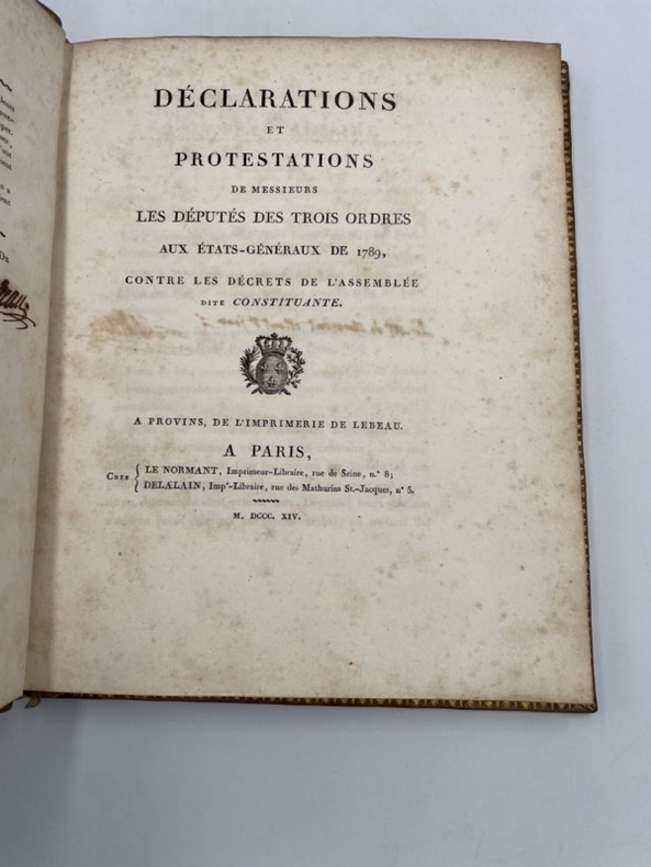 Rare et fascinant témoignage sur les émigrés qui, en vingt ans de bouleversements politiques, n'avaient "rien oublié ni rien appris". Jacques de Clermont-Mont-Saint-Jean (1752-1827) avait été élu aux États généraux par la noblesse de Bugey le 24 mai ; il s'opposa à tout, réunion des Trois Ordres, vote par tête, et alla de nouveau devant ses commettants après la séance royale, pour leur demander des instructions. Avec d'autres députés, il présenta une protestation contre la transformation des États en Assemblée constituante, puis se retira de la vie politique, avant d'émigrer un peu plus tard.Ce sont ces protestations de la partie la plus réactionnaire de l'Assemblée, étagées du 13 avril 1790 au 16 septembre 1791, qu'il publie enfin, 25 ans après, au moment où s'élabore la Charte, et où tout le monde cherche une synthèse entre les anciennes institutions et les nouvelles...Absent de Martin & Walter. Bel exemplaire. - - VENTE PAR CORRESPONDANCE UNIQUEMENT