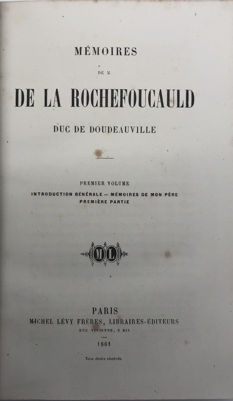 Édition originale, la seule publiée. De toute rareté.Les tomes 1 à 5 sont consacrés à l'Ancien Régime et à la Révolution sous le titre de Mémoires de mon père et de Ma Jeunesse. C'est à la fin du tome 5 que commencent réellement les Mémoires de M. de La Rochefoucauld, duc de Doudeauville, avec la période des Cent-Jours. La partie consacrée à l'Empire est donc extrêmement limitée.C'est par contre un des témoignages les plus importants sur la Restauration et la Monarchie de Juillet : "Il donne de très nombreuses indications sur la vie politique, littéraire et artistique à l'époque de la Restauration et jusqu'en 1843" (Bertier).Fierro, 828. Tulard, 843. Bertier, 600.Bon exemplaire. - - VENTE PAR CORRESPONDANCE UNIQUEMENT