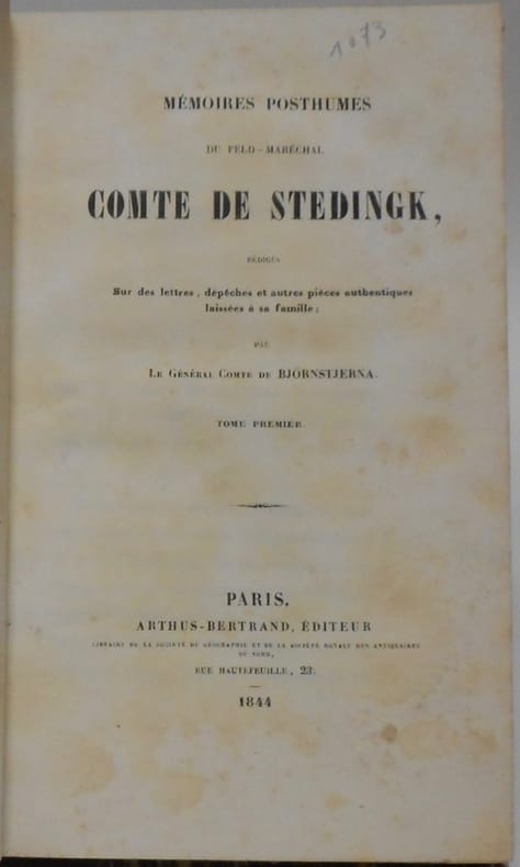 Tulard, 1376 : "Le tome II porte, par erreur, la mention : tome deuxième et dernier. Comme militaire et diplomate, Stedingk fut acteur ou témoin des grands événements de l'époque concernant son pays : guerres russo-suédoise de 1788-1790 et 1808-1809, élection de Bernadotte comme prince royal de Suède, invasion de la Poméranie suédoise par les troupes françaises, campagnes de 1813-1814 en Allemagne à la tête d'un corps suédois sous les ordres de Bernadotte, paix de Paris dont il fut l'un des signataires."Stedingk commença sa carrière militaire sous l'uniforme français sous les ordres du comte d'Estaing lors de l'expédition aux Antilles et en Amérique au temps de Louis XVI.Le général comte de Björnstjerna était l'un des gendres de Stedingk. - - VENTE PAR CORRESPONDANCE UNIQUEMENT