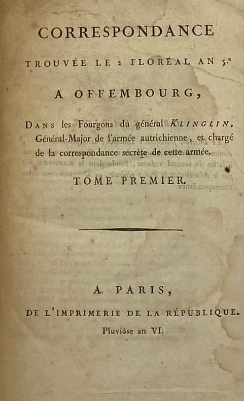 Rare prise de guerre, en partie chiffrée, effectuée par les troupes commandées par Moreau après le siège d'Offenburg, et publiée seulement après la signature des préliminaires de paix avec l'Autriche. Elle est précédée de deux pièces saisies sur des espions (dont le fameux d'Antraigues).Martin & Walter, Anonymes, 4750-51. - - VENTE PAR CORRESPONDANCE UNIQUEMENT - LIEN DE PAIEMENT, NOUS CONSULTER.