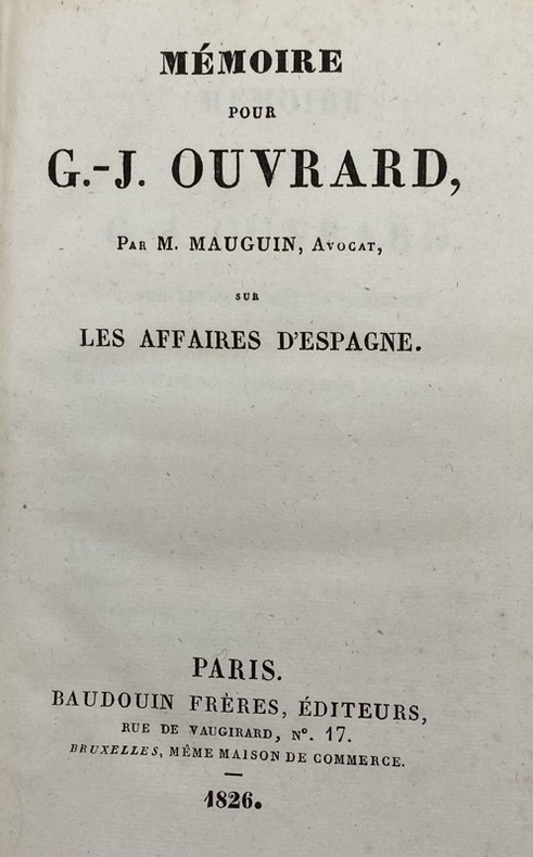 Edition originale de ce plaidoyer de l'avocat Mauguin, retraçant le détail des opérations menées, avec le gouvernement Cortès, par Gabriel Julien Ouvrard (1770-1846) - célèbre banquier de Napoléon et premier gouverneur de la Banque de France - sur les problèmes financiers de la déclaration de guerre à l'Espagne.Ouvrard finança en effet l'expédition de 1823 mais ne fut jamais remboursé. Le scandale des marchés d'Espagne qui en suivit le ruine et l'envoie à la Conciergerie.Ouvrard avait édifié des fortunes dès la période révolutionnaire qui le mirent en butte aux tracasseries de Napoléon comme des Bourbons par la suite.Ce mémoire qui travaille à le disculper traite notamment des marchés de Bayonne et du rapport de la Commission d'enquête. Il fut aussi réhabilité grâce au duc d'Angoulême, mais uniquement dans la société car il ne récupérera jamais sa fortune.Bon exemplaire. - - VENTE PAR CORRESPONDANCE UNIQUEMENT