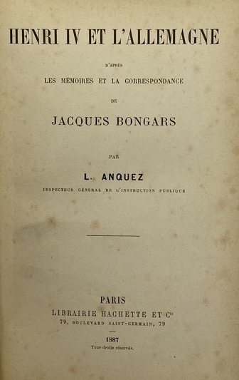 Édition Léonce Anquez. Le calviniste Jacques Bongars seigneur de Bauldry et de La Chesnaye (1554-1612) fut l'agent d'Henri IV auprès du Saint-Empire. Historien et philologue, il est l'auteur d'ouvrages d'histoire romaine et d'histoire des croisades. Hauser 2704.