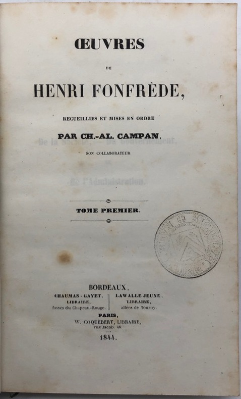 Unique édition collective, peu commune, des pièces et essais du journaliste politique bordelais Henri Boyer-Fonfrède (1788-1841), fils du conventionnel girondin Jean-Baptiste Boyer-Fonfrède (1765-1793). D'opinions libérales, c'est-à-dire opposées à la monarchie bourbonienne, en une ville qui s'enorgueillissait d'avoir posé le premier acte de son rappel, il fonda le journal La Tribune, diffusant des opinions démocratiques fort avancées, puis, après sa suppression, l'Indicateur de Bordeaux. En 1832, il donna le signal de la résistance locale aux Ordonnances, et se rallia naturellement au nouveau régime.Charles-Louis-Alcée Campan (1800-1877), l'éditeur de cette collective, également bordelais, avait été un des collaborateurs de Fonfrède dans ses campagnes contre la branche aînée, mais sa destinée le conduisit en Belgique où il se maria et devint le secrétaire de Tielemans, premier ministre de l'Intérieur du jeune royaume. Revenu à Bordeaux en 1838, il vécut en paix sous la Monarchie de Juillet, avant de s'exiler volontairement dans le pays de sa femme après le 2 décembre, et il mourut à Bruxelles. Envoi de ce dernier. au tome 1. - - VENTE PAR CORRESPONDANCE UNIQUEMENT