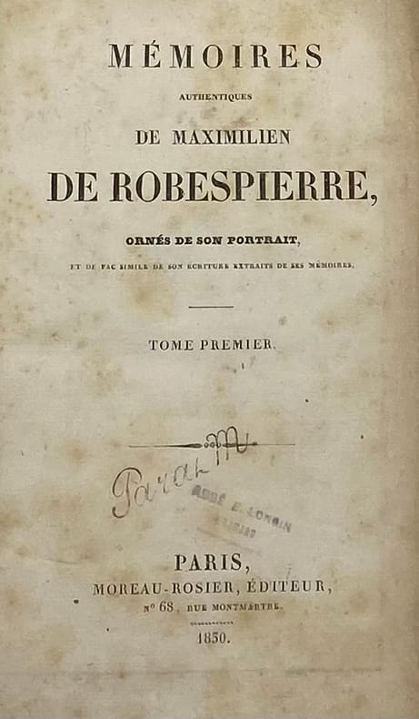 Fierro, 1268. "Ces mémoires devaient comporter 4 volumes. La Révolution de Juillet 1830 en arrêta la publication. Ils étaient rédigés par Ch. Reybaud. La sœur de Maximilien les désavoua formellement dans une lettre adressée le 24 mai 1830 à l'Universel".Le portrait annoncé n'a jamais été livré avec les exemplaires. - - VENTE PAR CORRESPONDANCE UNIQUEMENT