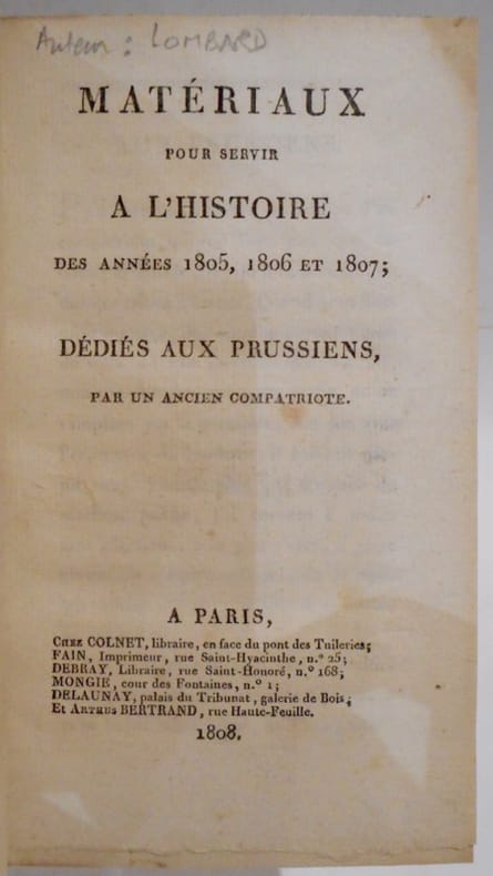 Tulard, 912 : "Lombard était un homme d'état prussien d'origine française. Chargé de la conduite de la politique extérieure de son pays, il s'efforça, en vain, de maintenir la Prusse dans sa neutralité. Il fut rendu responsable de la défaite de 1806 et, poursuivi, se réfugia en France où il finit ses jours. L'ouvrage est destiné à justifier son attitude."Précieux exemplaire du général Jomini avec son ex-libris (cachet humide) sur la page de titre. - - VENTE PAR CORRESPONDANCE UNIQUEMENT