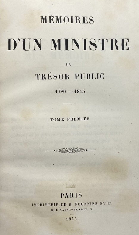Tome 3 seul (sur 3) : de 1811 à 1815 — Nouvelle édition des mémoires de François-Nicolas Mollien (1758-1850), ministre du trésor public de 1806 à 1814, puis durant les cent-jours, rédigés à partir de 1817 afin de se justifier : tableau de la situation financière de la France à l'avénement de Bonaparte, entretiens et correspondances avec Napoléon, principes financiers qu'il a suivi, études des budgets, effet du système continental, financement des guerres, attitude de l'opinion devant les impôts. L'ouvrage se termine sur la situation de la caisse générale du Trésor impérial et la réfutation des « prétendues malversations du gouvernement impérial dénoncées en juillet 1814 ». — "Remarquables mémoires dont la consultation est indispensable pour l'histoire intérieure de l'Empire." (Tulard, 1034)