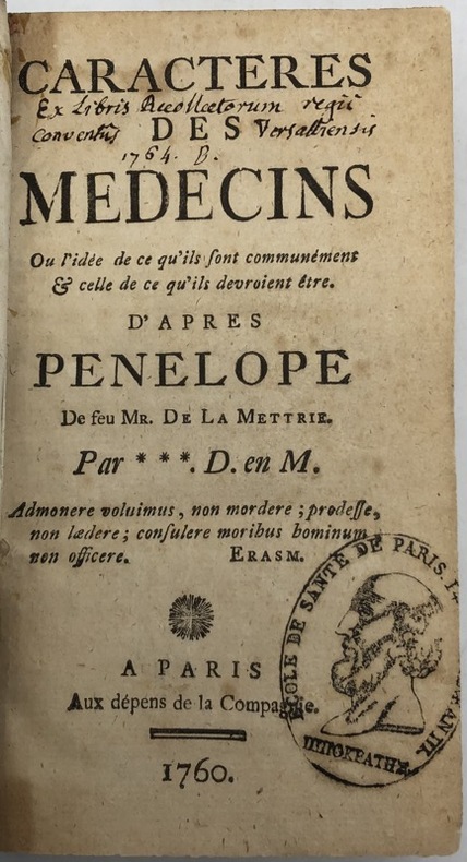 Unique édition de cet ouvrage que l'on n'hésite plus désormais à attribuer à La Mettrie, pour ne laisser à Jean-Philippe de Limbourg (1726-1811), célèbre médecin liégeois exerçant dans les Pays-Bas autrichiens, près de Spa, que le titre d'éditeur. Il s'agit d'un développement des idées de la Pénélope où, poussant la satire et le raisonnement plus avant, l'auteur n'hésite plus à s'en prendre non seulement à ses confrères médecins, mais aussi à la médecine de son temps.Stoddard, 62. - - VENTE PAR CORRESPONDANCE UNIQUEMENT