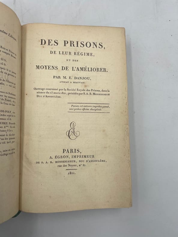 Unique édition de cet ouvrage rare, tiré à 500 exemplaires.Ernest Danjou était avocat à Beauvais. Son œuvre, "consacrée à une réflexion sur les améliorations à apporter au régime des prisons et destinée au grand public plutôt qu'aux prisonniers, ne fut souscrite qu'à 500 exemplaires par le Conseil Général." (Petit, Ces Peines obscures, p. 190). Ces réformes ne furent pas appliquées quoique l'ouvrage ait été officiellement primé. Danjou préconise, entre autres, l'éducation des détenus par le travail.Grandin, I, 556. - - VENTE PAR CORRESPONDANCE UNIQUEMENT - LIEN DE PAIEMENT, NOUS CONSULTER.