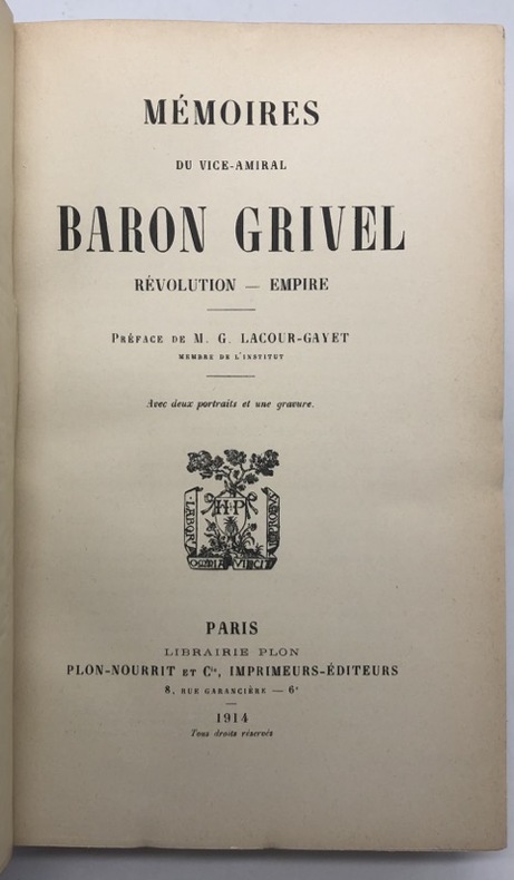 "Armée des Pyrénées, navigation en Méditerranée à la veille de Brumaire" (Fierro 675). "Source importante pour l'histoire de la Marine impériale, la guerre d'Espagne, les pontons de Cadix, la campagne de France" (Tulard 653). Bon exemplaire de cette édition ornée de 2 portraits et d'une gravure.