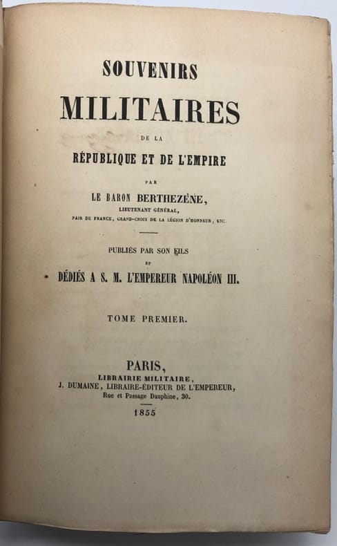 Tulard, 140 "Malgré quelques erreurs, il a l'avantage sur d'autres généraux de s'attacher à décrire les pays occupés ou envahis".La première partie du tome 1 est consacrée aux campagnes d'Italie, de 1797 à 1801, durant lesquelles Berthézene fut blessé deux fois et fut nommé au grade de chef de bataillon, à l'âge de 25 ans.Sa brillante carrière militaire se poursuit en Prusse (1806-1808). Il relate ensuite l'expédition des anglais contre Anvers (1809). La campagne de Russie est abondamment racontée à la fin du tome 1 et dans la première moitié du tome 2. Ses souvenirs se poursuivent avec la campagne de 1813 et se terminent par un important chapitre sur Waterloo, campagne où il eut deux chevaux tués sous lui. - - VENTE PAR CORRESPONDANCE UNIQUEMENT