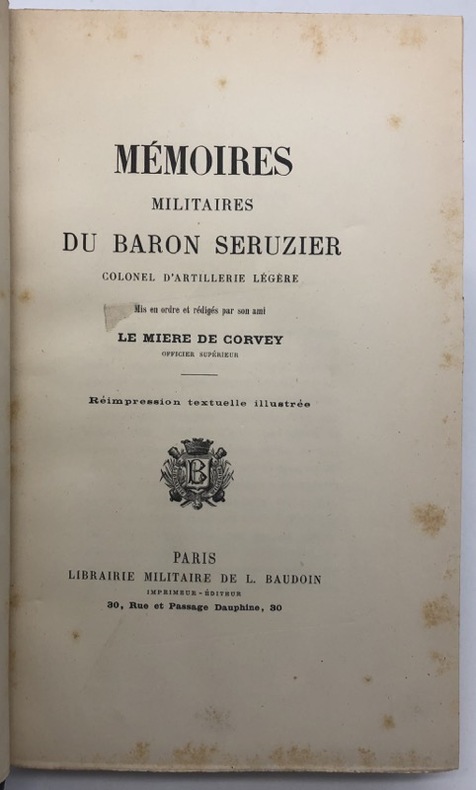 Paris, Baudoin, s.d. (1894) in-8, IX-344 pp., portrait et ill., index, demi-basane noire, dos lisse (reliure de l'époque). Dos frotté, coupes et coins usés, nombreux cachets de bibliothèques militaires.