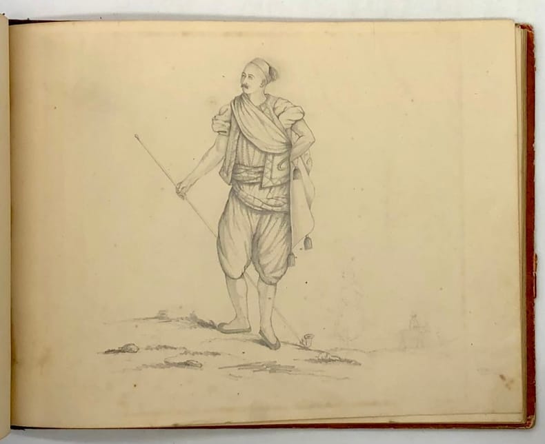 Emouvant carnet de croquis et de dessins d'un soldat engagé dans la conquête de l'Algérie sous la Monarchie de Juillet, et sur lequel on ne sait malheureusement rien. Les aquarelles forment un travail naïf où le pittoresque démonstratif l'emporte sur le documentaire, mais l'ensemble constitue sans doute une des premières iconographies privées de certains endroits de Kabylie.1. Groupe de soldats avec une cantinière (au crayon de bois - signé L.N.). - 2. Soldat indigène (au crayon de bois). - 3. La Soumann' [= La Soummam, vallée en Kabylie] (une aquarelle de 12 x 19 cm), contrecollée). - 4. Dellys [localité entre Boumerdès et Tizi Ouzou] (une aquarelle en médaillon, entourée d'un décor arabisant rouge, et contrecollée). - 5. Dialogue de deux indigènes dans un décor de docks (aquarelle de 9 x 13 cm). - 6. Fleurs et fruits (aquarelle gommée de 18 x 12 cm). - 7. Une baie (au crayon de bois). - 8. M'Sila [ville des plateaux du Hodna] (une aquarelle en médaillon, entourée d'un décor arabisant noir, et contrecollée). - 9. Biskraa, porte du vllage nègre [Biskra] (une aquarelle en médaillon, entourée d'un décor arabisant noir, et contrecollée). - 10. Vue du Jurjura [= Djurdjura, massif montagneux du nord d l'Algérie] (une aquarelle en médaillon, entourée d'un décor arabisant rouge et noir, et contrecollée). - 11. Les Monts Orestes [?] (une aquarelle en médaillon, entourée d'un décor arabisant, et contrecollée). - 12. Le Palais du gouverneur d'Alger (une aquarelle en médaillon, entourée d'un décor arabisant, et contrecollée). - 13. Il'Affronn [= El Afroun, ville proche de Blida] (une aquarelle en médaillon, entourée d'un décor arabisant noir, et contrecollée). - 14. Chasse au lion (une aquarelle en médaillon, entourée d'un décor arabisant noir, et contrecollée). - 15. Marabout (une aquarelle en médaillon, entourée d'un décor arabisant blanc et noir, et contrecollée). - 16. Un campement la nuit (une aquarelle en médaillon, entourée d'un décor arabisant jaune, et contrecollée). - - VENTE PAR CORRESPONDANCE UNIQUEMENT - LIEN DE PAIEMENT, NOUS CONSULTER.