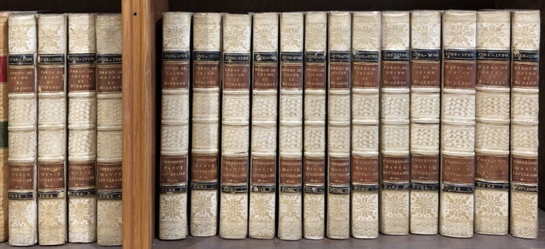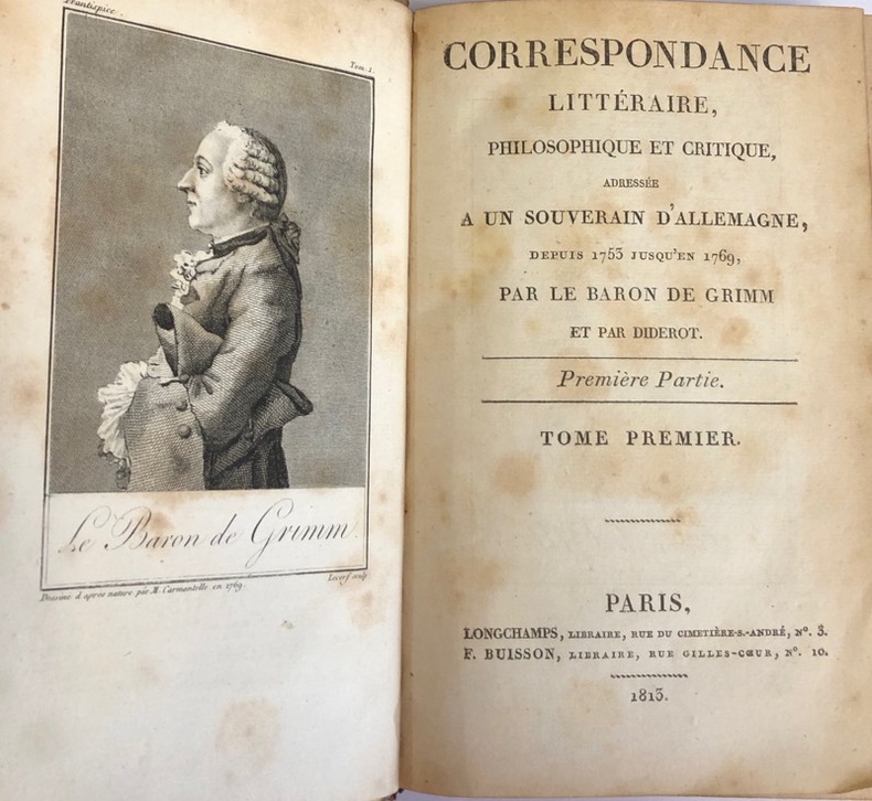 Première édition.Ensemble bien complet de cette célèbre et importante correspondance littéraire.Elle est complète de ses trois parties et de son Supplément qui se répartissent de la manière suivante :I. Les six volumes de la première série (1753-1769) donnés par Michaud et Chéron et parus en 1813.II. Les cinq volumes de la seconde série (1770-1782) procurés par Salgues et parus dès 1812 parce cette seconde partie était estimée la plus intéressante pour le lecteur. Dans le premier volume de celle-ci, figure une notice sur Grimm.III. Les cinq volumes de la troisième série (partie des années 1775-1776 et 1782-1790) publiés par Suard en 1813.IV. Le volume (paru en 1814) de Supplément contenant les opuscules de Grimm ; treize lettres de Grimm à Frédéric II, roi de Prusse ; plusieurs morceaux de la Correspondance de Grimm qui manquent aux 16 volumes ; des remarques sur les 16 volumes par Antoine-Alexandre Barbier."Grimm n'est pas l'inventeur des correspondances littéraires : périodiques manuscrits destinés à une clientèle d'élite, princière et étrangère. Il en a seulement donné l'archétype classique grâce à des collaborateurs qui ont immortalisé la sienne, Diderot au premier chef" (François Moureau).Mors supérieur fendu au tome 1, début de fente au mors supérieur du tome 6, quelques rousseurs.Bel exemplaire cependant.L'ouvrage a d'abord appartenu à une membre du clan Colquhoun (famille écossaisse) avec leur ex-libris. Il est ensuite passé dans la bibliothèque d'Edmond Lebee (ex-libris). - - VENTE PAR CORRESPONDANCE UNIQUEMENT