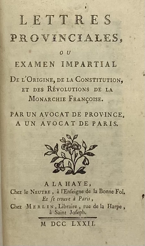 Unique édition, peu commune.En effet, l'ouvrage fut supprimé dès sa parution, et l'auteur n'échappa à la Bastille que par la protection de Maupeou. On sait très peu de choses sur Pierre Bouquet (1715-1781), qui mourut bibliothécaire de la ville de Paris, mais ne publia que sur le droit public et les institutions anciennes, dans un esprit qui déplut toujours aux Parlements, par son attachement à l'autorité plénière du Roi.Absent de Dupin. - - VENTE PAR CORRESPONDANCE UNIQUEMENT