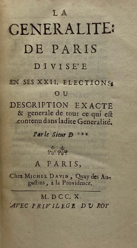 Ouvrage rare qui retient une approche thématique pour aborder l'organisation de la généralité de Paris : I. De la Justice. II. Des Finances. III. De la qualité des terres de chacune Election. IV Des Forest en général. V. Des Manufactures et et du Commerce des Foires et Marchez. VI. Des Pont et Chaussées, des Péages & Travers en général. VII. Des Mines, métaux & autres richesses souterraines & générales. VIII. Des Maisons Royales. - - VENTE PAR CORRESPONDANCE UNIQUEMENT