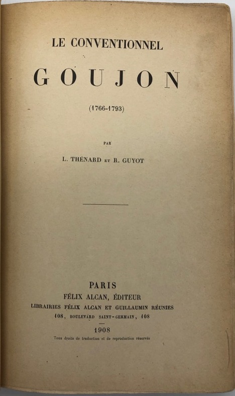 Tiré à part d'une série d'articles parus dans la Revue Historique. Les sept premiers chap. écrits par L. Thénard, ont été publiés après sa mort dans le présent ouvrage, R. Guyot est l'auteur des sept derniers. Les auteurs se sont appuyés sur les Archives publiques ainsi que des archives de famille conservées par la petite-nièce du conventionnel.Le chap. VIII décrit de façon approfondie la crise de germinal et prairial an III qui signera la chute des derniers Montagnards Goujon, Romme, Duquesnoy, Bourbotte, Duroy et Soubrany. - - VENTE PAR CORRESPONDANCE UNIQUEMENT