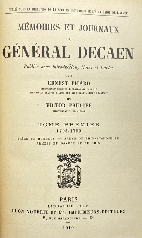 Tulard, 406. "Relation de la bataille de Hohenlinden qui met en lumière le rôle de Moreau auquel Decaen est favorable. A retenir également, la rencontre avec Bonaparte, le conflit entre le Premier Consul et Moreau, le portrait défavorable de Decrès, la préparation de l'expédition pour la reprise des établissements de l'Inde, Pondichéry et l'Ile-de-France, les rapports avec Cavaignac à Mascate".Exemplaire de la bibliothèque de Marcel Dunan avec son ex-libris contrecollé sur la première garde. Marcel Dunan, historien, membre de l'Académie des Sciences Morales et Politiques, fut président de l'Institut Napoléon de 1947 à 1974. - - VENTE PAR CORRESPONDANCE UNIQUEMENT