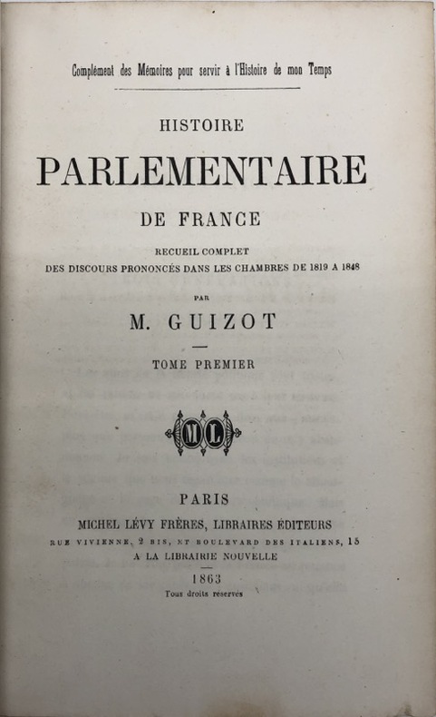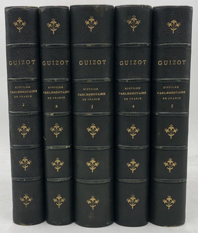 Edition originale de ce qui n'est autre que la publication de tous les discours parlementaires de Guizot au long de ses différents mandats. Le titre général de "Histoire parlementaire de France" sonne à ce titre de façon un peu exagérée, même si Guizot fut, bien évidemment, un acteur majeur de la vie parlementaire de la Restauration et de la Monarchie de Juillet.L'ensemble est précédé d'un important texte politique : Trois générations. 1789. - 1814. -1848. L'ancien ministre de Louis-Philippe y développe avec finesse les caractéristiques politiques et idéologiques des hommes qui arrivèrent à maturité respectivement lors des Etats-Généraux, lors de la chute de Napoléon et au moment des évènements de 1848.Bon exemplaire. - - VENTE PAR CORRESPONDANCE UNIQUEMENT