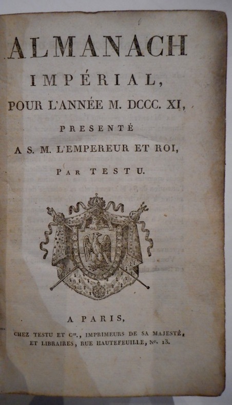 1811 Paris: Testu et Cie, [1811]. In-8: 13.5 x 22.5 cm, 964 pp. Rare Almanach impérial pour l'année 1811. Reliure de l'époque, en veau blond, aux armes du Comte Conseiller d'Etat Antoine Français de Nantes (1756-1836). Dos lisse avec pièce de titre de maroquin rouge, pièce de tomaison de maroquin vert, deux caissons dorés à la grotesque et deux autres ornés de l'aigle impérial. Plats encadrés de dentelles à palmettes et marqués des armes du Comte conseiller d'Etat en couleurs. Volume doré sur les trois tranches, roulettes dorées aux chasses. Page de titre restaurée, gouttières renforcées. Fort volume, en bon état général, et d'intéressante provenance.