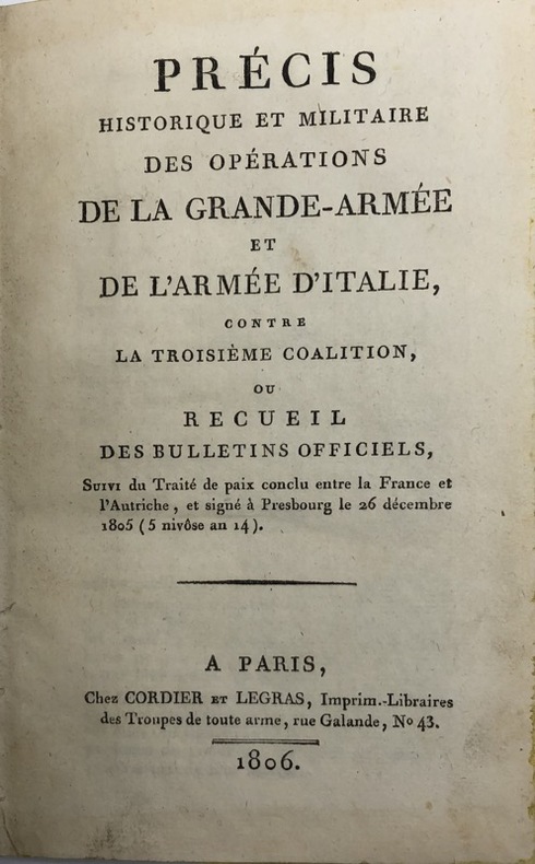 Réunit les 37 bulletins de la Grande Armée (4 octobre - 26 décembre 1805) et les 9 bulletins de l'Armée d'Italie (18 octobre - 27 novembre 1805).Pas dans Kircheisen ni dans Davois.Bel exemplaire. - - VENTE PAR CORRESPONDANCE UNIQUEMENT