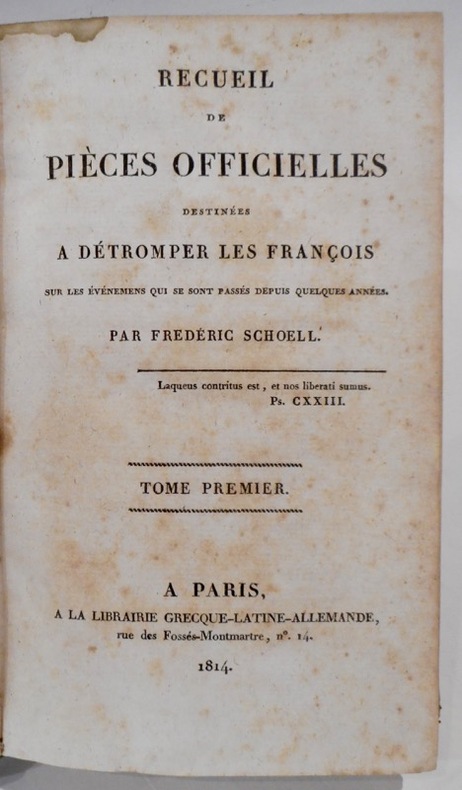 Parue en livraisons, cette série de documents se voulait une entreprise de "désintoxication" médiatique après le régime de censure impériale, qui ne laissait filtrer que très peu d'informations exactes. Le succès de cette compilation fut considérable : les Français découvraient par là quantité de pièces et de documents jusque là inaccessibles.Les séries complètes sont rares.Quérard VIII, 540. Davois III, 165.Bon exemplaire. - - VENTE PAR CORRESPONDANCE UNIQUEMENT