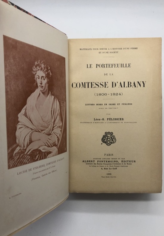 Albert Fontemoing 14,5 x 23 Paris 1902 Fort in-8, reliure demi-chagrin marron de l'époque, dos à cinq nerfs, titre et date dorés, plats et gardes marbrées, XXVIII-726 p., portrait en frontispice, table chronologique des lettres, table des correspondants, index. Publication de 359 lettres des correspondants très cosmopolites de la comtesse d'Albany (1752-1824), qui couvrent la période de l'Empire à la Restauration (1806-1824). Le salon de la comtesse d'Albany "exerçait à Florence une façon de royauté intellectuelle, littéraire et mondaine". Cette correspondance est tirée du fonds Albany de la bibliothèque de Montpellier, legs du peintre montpelliérain François-Xavier Fabre, intime de la comtesse d'Albany. Notre exemplaire est enrichi en tête du bel ex-libris du bibliophile Paul Cordier, gravé sur cuivre représentant deux cordiers au travail dans un cadre ovale cerné de cordes, avec la devise « Ne distrahetur » et les inscriptions dans un livre ouvert : Chroniques - Mémoires - Lettres. (Répertoire général des ex-libris français, C1838). Dos un peu frotté, papier jauni, une illustration moderne de la comtesse de Souza collée entre les pp.78 et 79. Petit ex-libris. Bon exemplaire. (B50). PHOTOS NUMERIQUES DISPONIBLES PAR EMAIL SUR SIMPLE DEMANDE-DIGITAL PHOTOGRAPS MAY BE AVAILABLE ON REQUEST