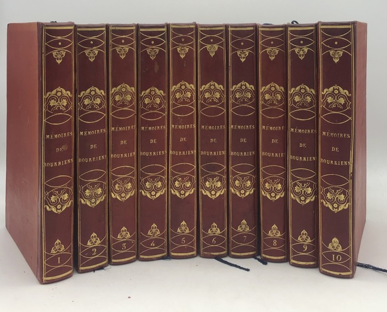 ÉDITION ORIGINALE, imprimée sur papier vergé. Les deux premiers tomes sont à la date de "1830" avec mention de "Troisième édition" ; les huit tomes suivants sont à la date de "1829" sans mention d'édition. « Publiés en 1829, ces mémoires firent sensation. Ils ont été depuis cette date, constamment utilisés par les historiens de Napoléon, surtout pour la jeunesse de Bonaparte ». Bien que ces mémoires contiennent des inexactitudes et aient été écrits dans un esprit hostile à l'Empereur, ils contiennent de curieux renseignements sur le blocus à Hambourg. Il faut aussi ne pas perdre de vue que les critiques sont surtout venues des bonapartistes. On peut donc souscrire au jugement d'Arthur Chouquet qui écrivait qu'il fallait lire ces mémoires avec précautions, et qu'ainsi on y trouverait quelquefois à prendre et à apprendre. (Tulard, 211). TRÈS BEL EXEMPLAIRE en reliure uniforme de ces FAMEUX MÉMOIRES, abondants en détails pittoresques sur la vie et le caractère de Napoléon. NICE COPY. PICTURES AND MORE DETAILS ON REQUEST.