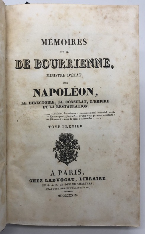 "Publiés en 1829, ces mémoires firent sensation. Ils ont été, depuis cette date, constamment utilisés par les historiens de Napoléon, surtout pour la jeunesse de Bonaparte. Ils appellent pourtant de graves réserves" (cf. pour plus de détails la longue notice de J. Tulard).Tulard, 211. - - VENTE PAR CORRESPONDANCE UNIQUEMENT