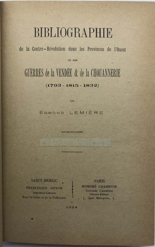 Ouvrage de référence, véritable bréviaire des guerres de la Vendée et de la chouannerie, une guerre civile qui opposa dramatiquement pendant plusieurs années les Provinces de l'Ouest aux armées de la Convention, du Directoire et du Consulat). Premier volume (1976, nouvelle édition tirée à 300 exemplaires, réimpression en fac-similé de l'édition parue entre 1904 et 1935) : "Bibliographie de la Contre-Révolution dans les Provinces de l'Ouest ou des Guerres de la Vendée et de la Chouannerie (1793- 1815- 1832) par Edmond Lemière. Continuée par son fils Yves et publiée grâce aux soins de M. Pierre Le Gail". Second volume (1980) : "Bibliographie de la Contre-Révolution dans les Provinces de l'Ouest ou des Guerres de la Vendée et de la Chouannerie (1793- 1815- 1832) par Yves Vachon. Pour servir de complément et de supplément jusqu'à nos jours à l'ouvrage de Lemière. Avec tables alphabétiques pour les deux ouvrages des noms d'auteurs, de personnes, de lieux, et des principaux thèmes"