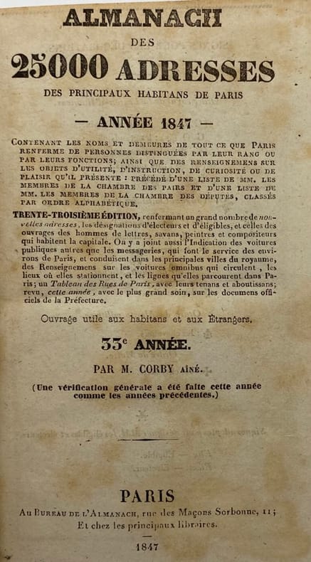 La première année de cet almanach fut publiée en 1815 sous le titre Almanach des adresses de Paris. Il fut publié jusqu'en 1848.Voir la longue notice de Grand Carteret, 1717. - - VENTE PAR CORRESPONDANCE UNIQUEMENT - LIEN DE PAIEMENT, NOUS CONSULTER.