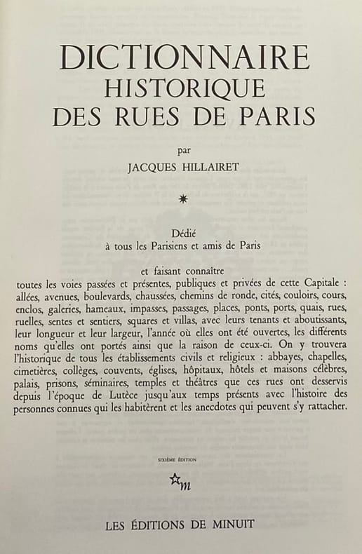 Deuxième édition de ce monumental ouvrage de référence, œuvre d'une vie. Il comprend : une histoire de la croissance de Paris, une série d’étude sur les particularités de la ville, une nomenclature complète des 5334 voies, une histoire des rues, une histoire des maisons intéressantes et des personnages célèbres qui y ont vécu, une vaste iconographie : 2200 gravures et photos, trois plans généraux : celui de Truschet et Hoyau (1551), le plan de Maire (1808) en vingt planches, le plan de Lecomte (1963) représentant le Paris actuel, un important appareil d’appoint. Au fil des 1500 pages, les quelques 5500 rues, voies, passages et autres quais que compte Paris nous narrent l'histoire de la ville. Ce dictionnaire est « dédié à tous les Parisiens et amis de Paris et faisant connaître toutes les voies passées et présentes, publiques et privées de cette Capitale : allées, avenues, boulevards, chaussées, chemins de ronde, cités, couloirs, cours, enclos, galeries, hameaux, impasses, passages, places, ponts, ports, quais, rues, ruelles, sentes et sentiers, squares et villas, avec leurs tenants et aboutissants, leur longueur et leur largeur, l'année où elles ont été ouvertes, les différents noms qu'elles ont portés ainsi que la raison de ceux-ci. On y trouvera l'historique de tous les établissements civils et religieux : abbayes, chapelles, cimetières, collèges, couvents, églises, hôpitaux, hôtels et maisons célèbres, palais, prisons, séminaires, temples et théâtres que ces rues ont desservis depuis l'époque de Lutèce jusqu'aux temps présents avec l'histoire des personnes connues qui les habitèrent et les anecdotes qui peuvent s'y rattacher. »