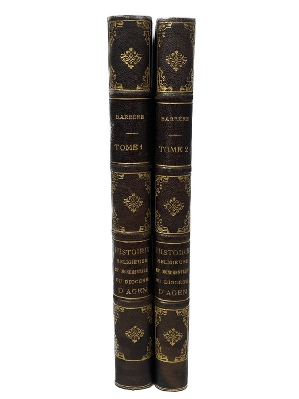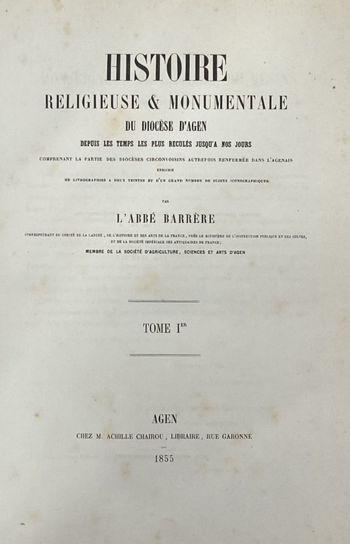 Agen, Chez M. Achille Chairou, 1855. Grand in-4 relié demi-basane rouge, lettrage, motif et filets dorés sur dos, xi-288 p. suivi de 11 planches. Livres I, II, III, IV. Le livre est incomplet : il s'arrête à la première page du chapitre IV du Livre IV. Les lithos (Imp. Auguste Bry) sont de L'Abbé Barrère : Agen (St Caprais), Gavaudun, Sérignac, Monsempron, Aiguillon, Moyrax, Mézin x 2, Marmande + 2 planches avec plusieurs figures. Très bon état.