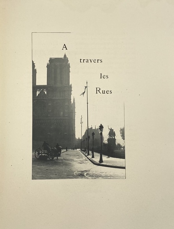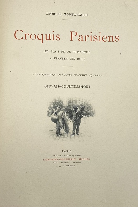 Tirage à 250 exemplaires numérotés. Celui-ci non justifié.Unique édition de ce bel album centré sur la vie quotidienne et les loisirs des Parisiens. Il comporte deux parties qui se distribuent thématiquement comme suit : 1. Les Plaisirs du Dimanche : La Pêche (VIII pp.). - Sur l'herbe (XI pp.). - Dans Paris (VI pp.). / 2. À travers les rues : La fleur des rues (VIII pp.). - Cochers (VI pp.). - Autour des marchés (IV pp.). - Pauvres gens (V pp.).Le photographe Jules-Claudin Gervais, dit Gervais-Courtellemont (1863-1931) s'acquit une grande renommée pour ses autochromes, dont une grande partie est toujours conservée ; et pour ses photographies des pays musulmans (à partir de son voyage à La Mecque en 1896, il se convertit à l'Islam). Vicaire V, 1113.Vignette ex-libris Yves-Louis Mongrolle. - - VENTE PAR CORRESPONDANCE UNIQUEMENT