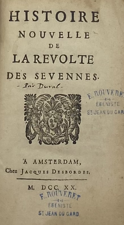 Rare. Dernière édition, absente des bibliographies.L'édition originale de cette histoire composée d'un point de vue catholique parut en 1708 sous le titre de Mémoires historiques de la révolte des fanatiques (Cioranescu, 27294). Le texte en fut profondément remanié dans la deuxième édition de 1712 (Histoire nouvelle et abrégée de la révolte des Cévennes, Cioranescu, 27295) et dans la troisième de 1713 (Histoire du soulèvement des fanatiques dans les Cévennes, Cioranescu, 27296). Les différences de texte ainsi que le maintien de l'anonymat pour toutes ces sorties firent croire qu'il s'agissait à chaque fois d'un ouvrage différent.Édition absente de Cioranescu.RELIÉE À LA SUITE : [AUBERT DE LA CHESNAYE DES BOIS :] Lettre à Madame la comtesse D*** pour servir de supplément à l'Amusement philosophique sur le langage des bêtes. S.l.n.d. [Paris, Gissey, 1739], pp. 3-46, manque la page de titre. L'opuscule complète normalement l'édition de 1739 de l'opuscule de Guillaume-Hyacinthe Bougeant.Cachet humide de E. Rouveret, ébéniste à Saint-Jean-du-Gard. - - VENTE PAR CORRESPONDANCE UNIQUEMENT