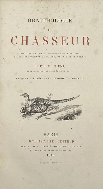 Édition originale de cette belle publication, superbement illustrée.Médecin et naturaliste, Jean-Charles Chenu (1808-1879) fit à la fois une carrière militaire remarquable, et se tailla une renommée dans le monde de la zoologie. Ses publications sur les oiseaux sont très nombreuses.Thiébaud, 191. - - VENTE PAR CORRESPONDANCE UNIQUEMENT
