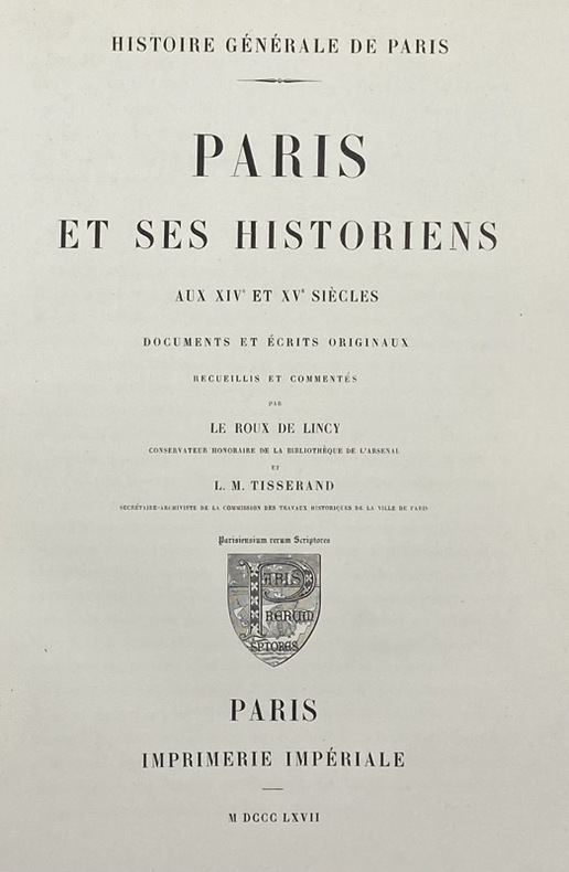 Collection Histoire générale de ParisParis, Imp. Impériale, 1867 fort gr. in-4, XXXVI-663 pp., nbses ill. h. t., demi-chagrin vert, dos à nerfs orné (rel. de l'éditeur). Dos passé et un peu frotté. Ex-libris Yves Louis Mongrolle.