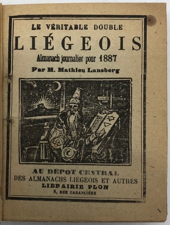 Une des très nombreuses déclinaisons du XIXe siècle du célèbre Almanach de Liège, dont la première année conservée remonte à 1626. D'après Grand-Carteret, sa première sortie remonterait à 1849, publiée d'abord par Pagnerre. On parcourra avec intérêt les numéros 2523 à 2531 pour avoir une idée des reprises de la fameuse éphéméride.Grand-Carteret, Almanachs, 2528. - - VENTE PAR CORRESPONDANCE UNIQUEMENT