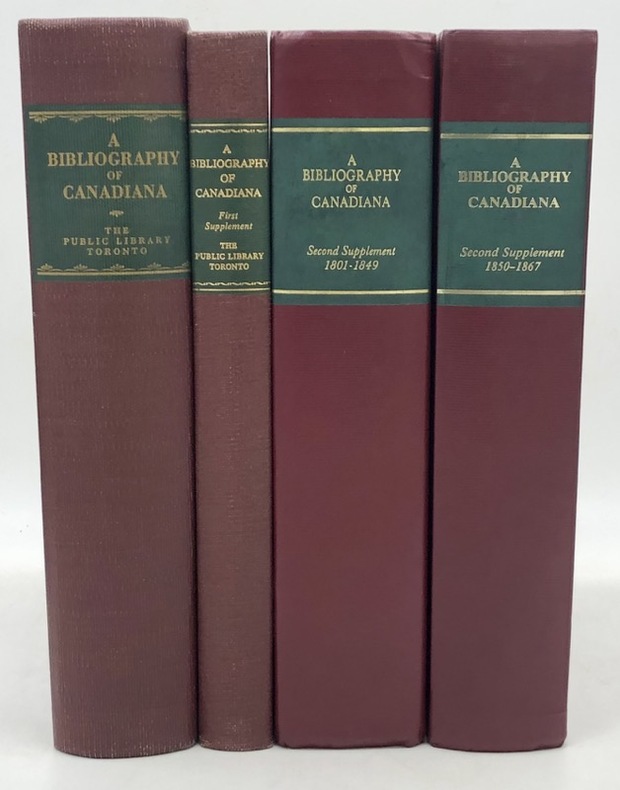 Bien supérieure au Gagnon, cette bibliographie publiée à partir des collections de la TPL (fondée en 1884) forme une liste à peu près exhaustive des ouvrages sur le Canada.I. [7] ff. n. ch., 828 pp., 4646 numéros décrits, avec une collette d'erratum (pour le numéro 1471). - II. First supplement [1959] : [8] ff. n. ch., 333 pp., un f. n. ch. d'errata, numéros 4647-6286, avec quelques illustrations dans le texte. - III. Second supplement. 1801-1849 [1985] : 839 pp., numéro 6800-8040. - IV. Second supplement, 1850-1867 [1986] : 910 pp., numéros 8041-9655.Manquent deux volumes : 1. Second supplement, 1512-1800. - 2. Index (paru en 1989). - - VENTE PAR CORRESPONDANCE UNIQUEMENT