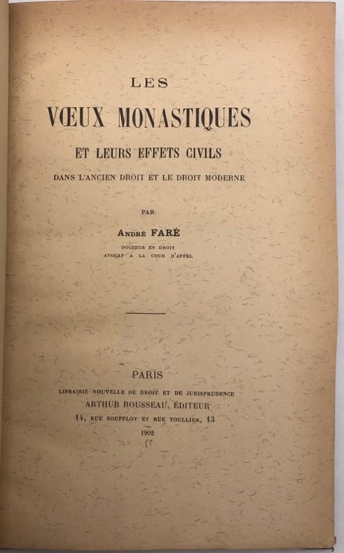 Unique édition de cette thèse de droit qui cherche à éclaircir une doctrine particulièrement embrouillée dans le droit civil, ancien ou moderne, par suite d'une transcription plus que partielle (ancien droit) ou nulle (droit moderne) des particularités qui régissent en droit canonique le statut personnel des profès à voeux solennels. - - VENTE PAR CORRESPONDANCE UNIQUEMENT