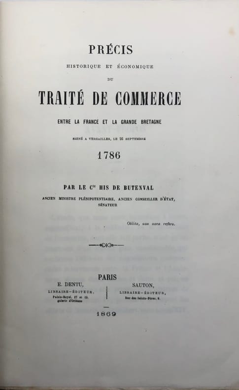 Unique édition. His de Butenval (1809-1883), ancien diplomate et désormais sénateur d'Empire, présente une critique raisonnée de l'opinion généralement négative qui a, en France, entouré ce traité de commerce depuis presque le lendemain de sa conclusion. Il faut préciser que l'auteur était anglophile et partisan du libre-échange.Exemplaire de l'importante bibliothèque napoléonienne du diplomate et historien Marcel Dunan (seconde vignette, dessinée par Maximilien Vox), avec classique reliure récupérée, dont il était coutumier. - - VENTE PAR CORRESPONDANCE UNIQUEMENT